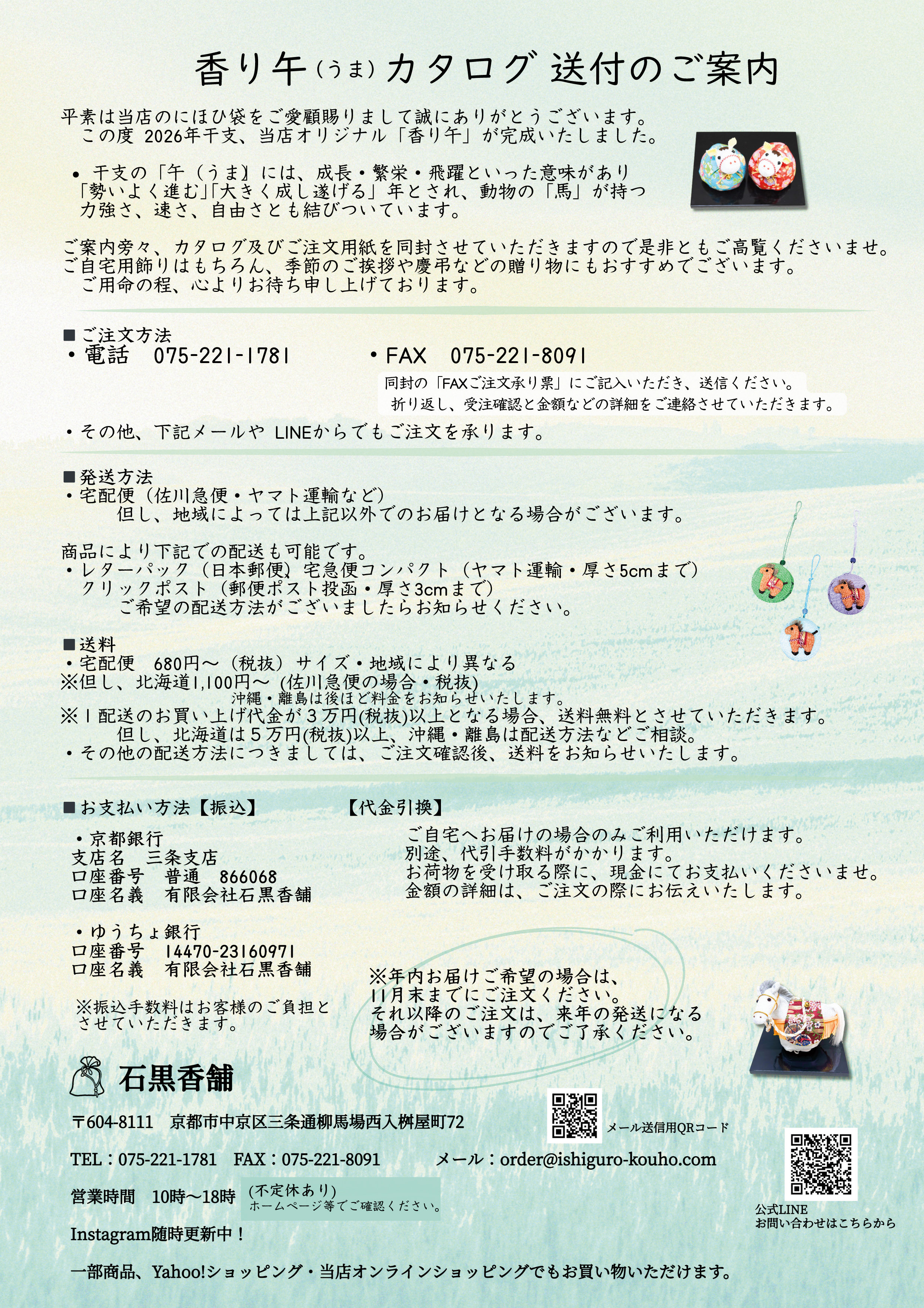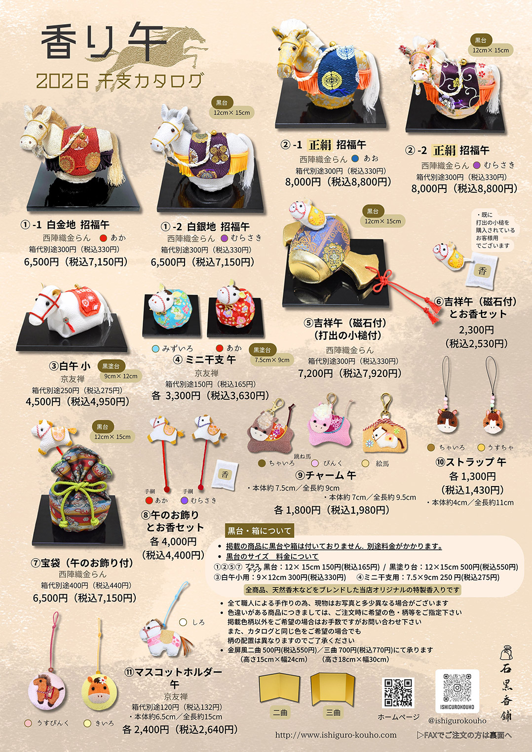 この度、2026年干支「香り午(うま)」が完成いたしました。 干支の置き物は開運・厄除けなどのお守り(縁起物)と云われております。 お玄関・床の間やお車などに飾って雅な香りをお楽しみくださいませ。