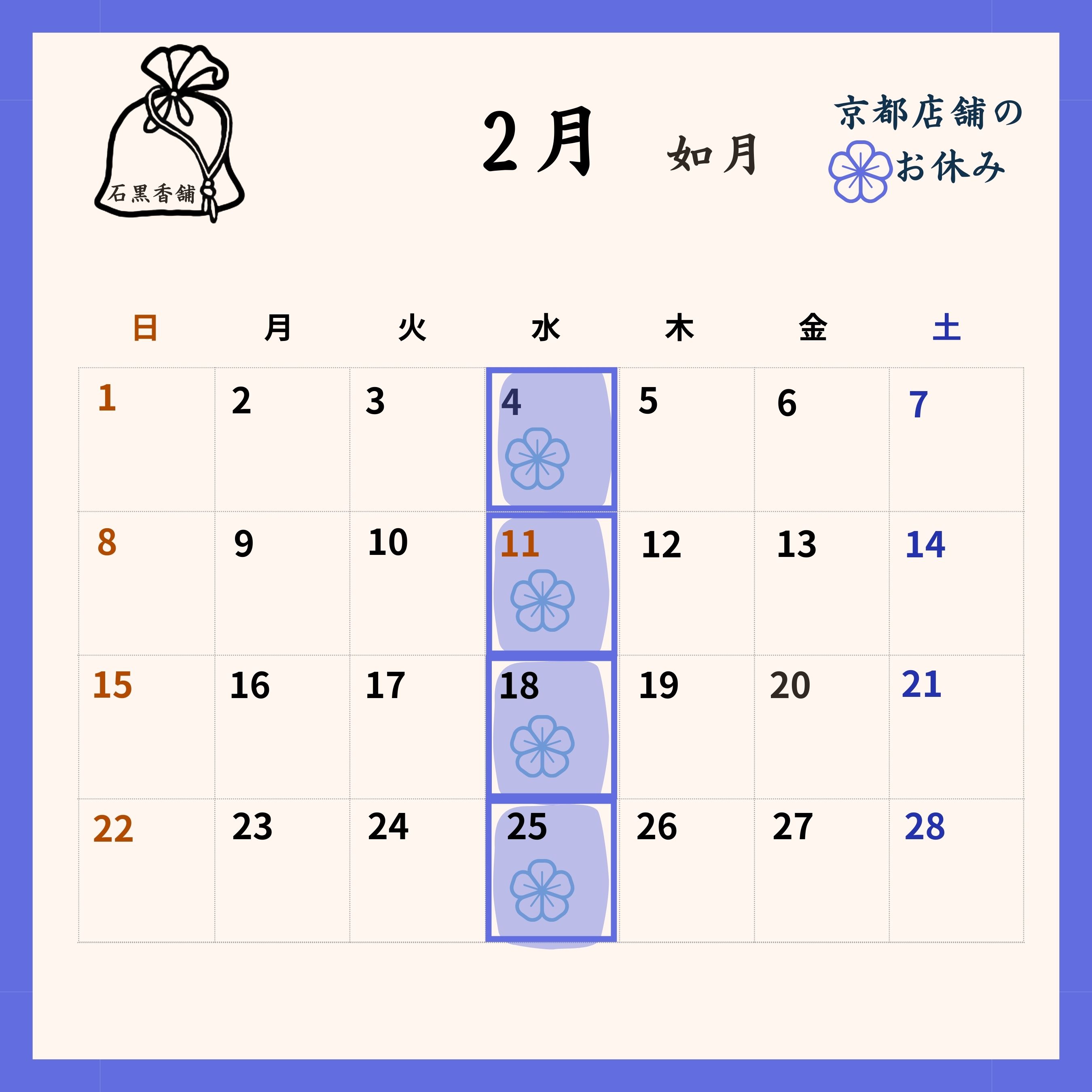 2/11(水・祝日)はお休みとなります。